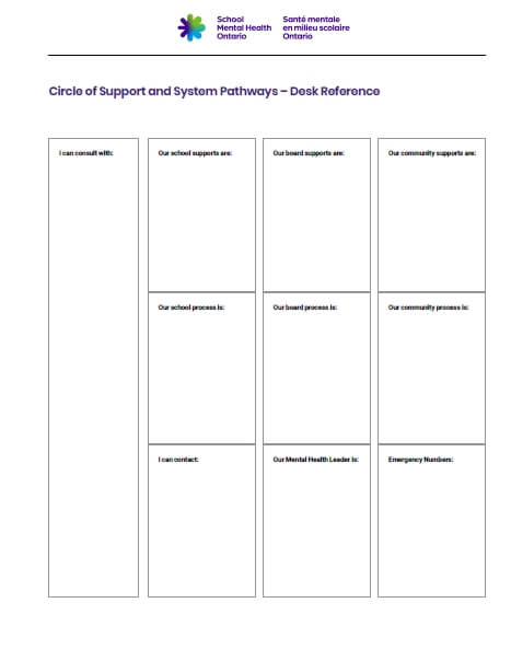 It is important to be aware of the resources, personnel and pathways within your school for help. The decision-tree template, Circle of Support and System Pathways Flowchart, is designed as a guide for staff when they are concerned about a student and wondering if additional mental health support might be required.  Working with your mental health leader, the text boxes in the worksheet may be populated to include local or specific board information (e.g. suicide protocol, community protocols, internal forms, processes etc.).